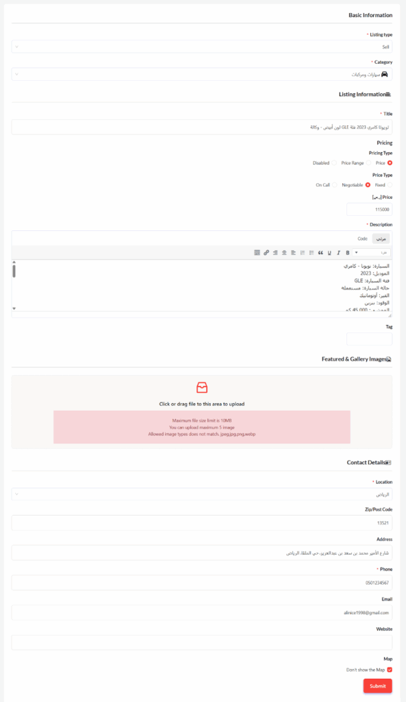 وبهذا أصبح الموقع جاهزًا لاستقبال الإعلانات المبوبة، حيث أصبح بإمكان أي مستخدم يرغب بإضافة إعلان أن ينقر على زر أضف إعلانك الموجود في الهيدر، ثم يقوم بتعبئة النموذج المطلوب وينقر على زر Submit لنشر الإعلان.