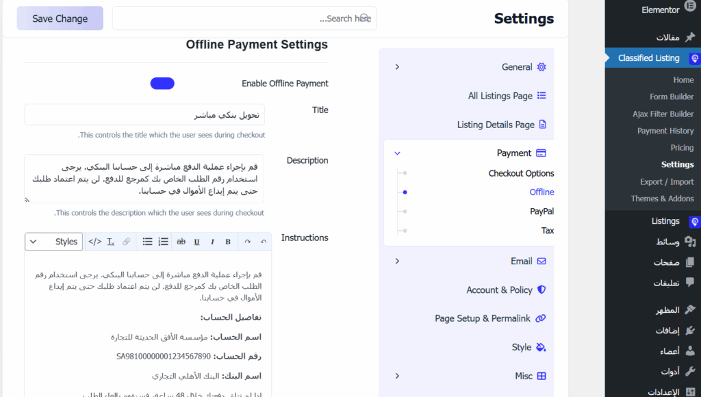 وبعد ذلك توجهت إلى Classified Listing ثم Settings، وانتقلت إلى تبويب Payment، وضبطت إعدادات الدفع من خلال تبويب Checkout Options، ثم أدخلت تعليمات التحويل اليدوي في تبويب Offline.