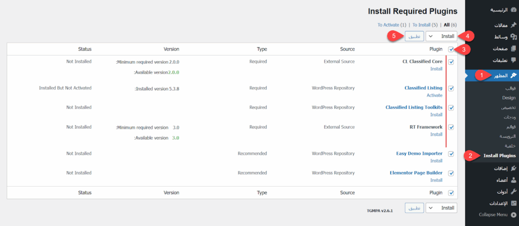 وبمجرد التفعيل طلب مني القالب تنصيب مجموعة من الإضافات اللازمة لعمله، مثل إضافة Classified Listing الأساسية لعمل الموقع، فانتقلت إلى المظهر > Install Plugins، ثم حددت كل الإضافات المطلوبة، واخترت Install من قائمة الإجراءات، ونقرت على زر تطبيق لتنصيب كل الإضافات المطلوبة دفعة واحدة.