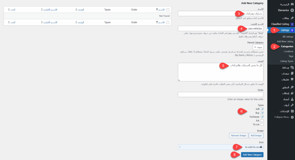 بعد استيراد الديمو، توجهت إلى Listings ثم Categories لضبط تصنيفات الإعلانات المبوبة واستبدال التصنيفات التي استُوردت مع الديمو بتصنيفات العميل المناسبة، حيث أزلت بدايةً كل التصنيفات الموجودة.