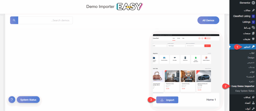 لاختصار وقت بناء الموقع، قمت باستيراد المحتوى التجريبي الذي يوفره القالب وعدلت عليه، حيث انتقلت إلى المظهر > Easy Demo Importer، ثم نقرت على زر Import الخاص بالديمو الوحيد الموجود.
