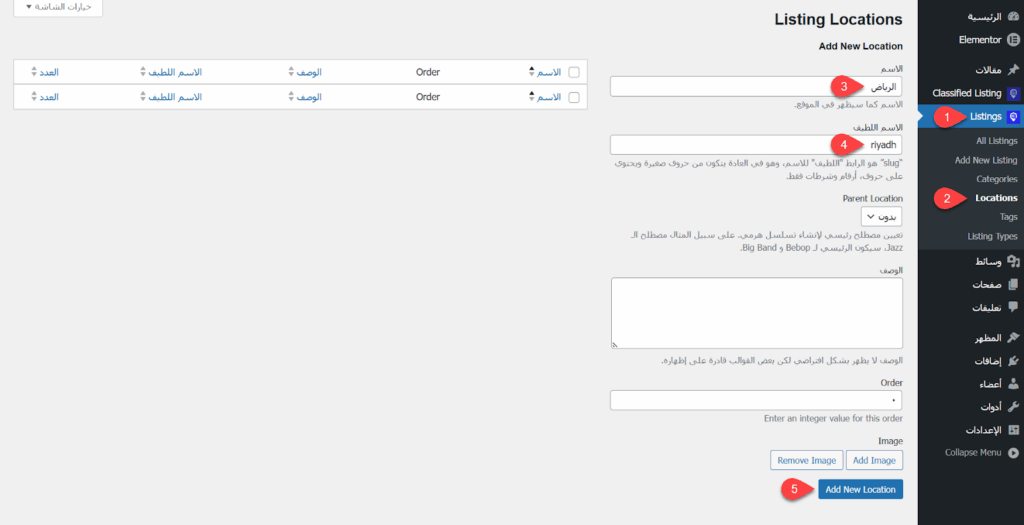 بعد إضافة التصنيفات، وبما أن الهدف من المنصة هو خدمة مناطق معينة بناء على رغبة العميل، فقد قمت بتضييق النطاق الجغرافي للمنصة، إذ انتقلت إلى Listings ثم Locations، وأزلت أولًا كافة المناطق المضافة بواسطة الديمو التجريبي.