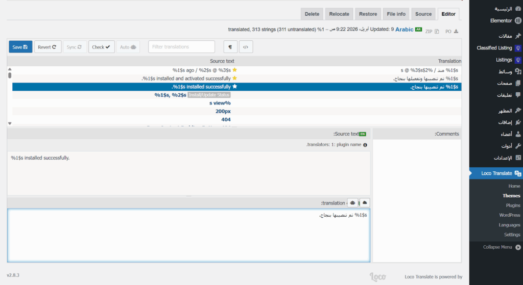 وبعد الانتهاء من ترجمة القالب، انتقلت إلى Loco Translate ثم Plugins، وترجمت أيضًا الإضافات المتعلقة بالقالب والإعلانات المبوبة (ترجمت العبارات المهمة التي ستظهر للزوار فقط، ووجهت العميل ليترجم باقي العبارات في القالب والإضافات مستقبلًا).