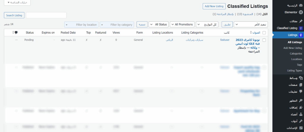 بعدها سيظهر الإعلان ضمن قائمة Listings التي يمكن الوصول إليها من خلال Listings ثم All Listings، ويمكن لمدير الموقع مراجعته والموافقة على نشره ليظهر للزوار في الواجهة الأمامية.