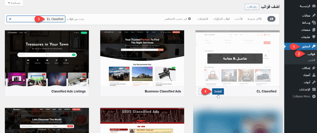 ولتثبيت القالب انتقلت إلى المظهر > قوالب > أضف قالبًا جديدًا، ثم أدخلت اسم القالب في مربع البحث (CL Classified)، ونقرت على زر تنصيب (Install) الخاص به، ثم فعلته بالنقر على زر التفعيل.