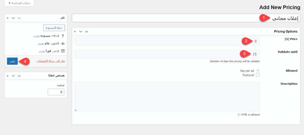 أدخلت اسم الخطة لتعبر عن أن الإعلان مجاني، ثم أدخلت السعر 0 في حقل Price، ثم اخترت مدة الإعلان في حقل Validate until، وبعد ذلك تأكدت من عدم تفعيل Featured لأن هذه الميزة ستكون في الخطة المدفوعة، حيث ستؤدي عند شرائها إلى تحديد الإعلان كمميز وعرضه في منطقة الإعلانات المميزة، وبعد ذلك نشرت الخطة بالنقر على زر نشر.