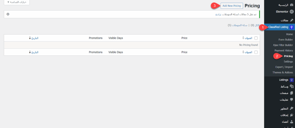 توجهت إلى Classified Listing ثم Pricing، ونقرت على زر Add New Pricing لإضافة خطة إعلان جديدة.