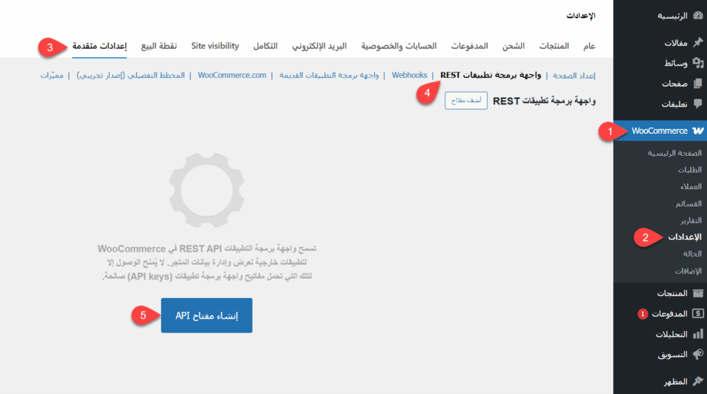 لكي يفهم المتجر لغة MCP، توجب علي تهيئة ووكومرس لهذا الأمر، ولفعل ذلك توجهت أولًا في لوحة تحكم ووردبريس إلى WooCommerce > الإعدادات > إعدادات متقدمة > واجهة برمجة تطبيقات REST، ثم نقرت على زر (إنشاء مفتاح API).