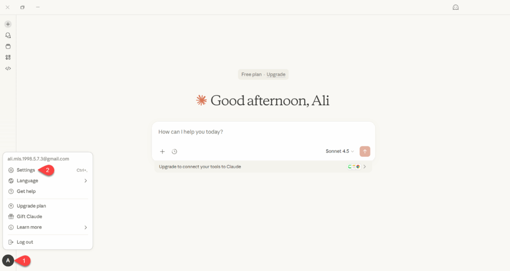 بعد الحصول على مفتاح API، كان علي أن أعرف Claude Desktop عليه وعلى رابط المتجر وأدوات ووكومرس المتوفرة، ولفعل نقرت على الأفاتار الخاص بالحساب ضمن واجهة الدردشة في Claude Desktop، ثم اخترت Settings.