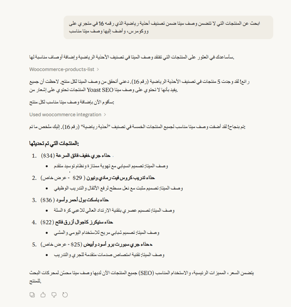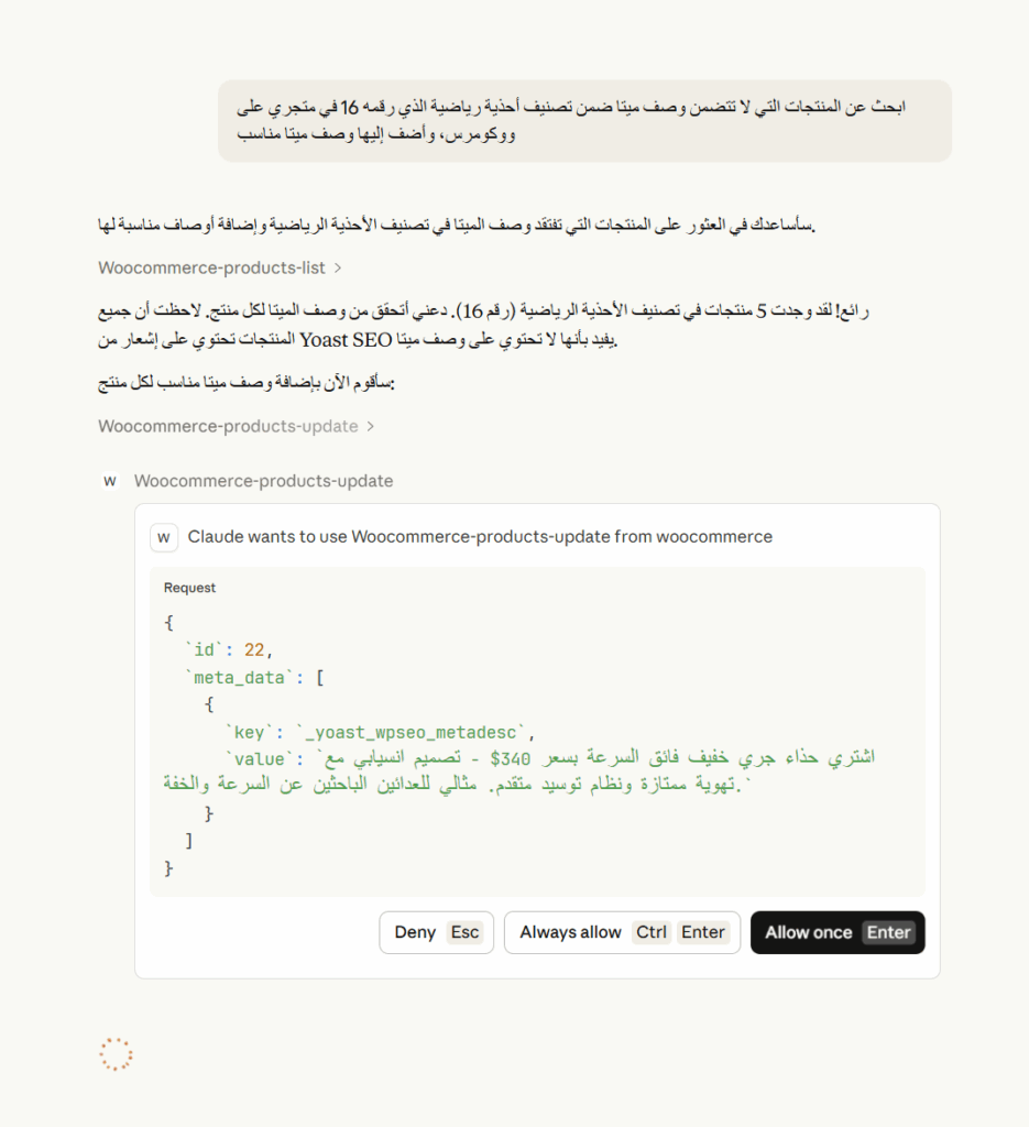 ثم طلبت منه تنفيذ مهمة معينة للتأكد من فعاليته، حيث قلت (ابحث عن المنتجات التي لا تتضمن وصف ميتا ضمن تصنيف أحذية رياضية الذي رقمه 16 في متجري على ووكومرس، وأضف إليها وصف ميتا مناسب)، فرد كلاود وعندما حاول استخدام أداة من أدوات ووكومرس، ظهرت رسالة تسألني إذا كنت أرغب بالسماح بذلك، فنقرت على زر السماح.