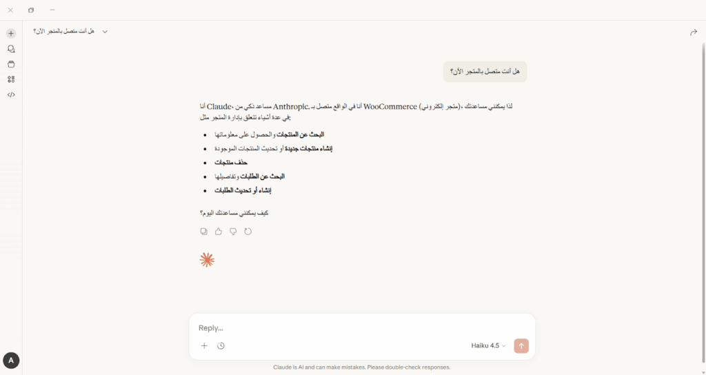 تأكدت ممن تفعليها، ثم كتبت رسالة في واجهة الدردشة وأرسلتها للتأكد أن Claude متصل الآن بالمتجر، فرد علي بتأكيد أنه متصل.