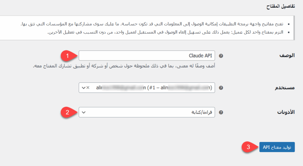 بعد ذلك أضفت وصفا للمفتاح لمعرفة غرضه لاحقًا عند رؤيته في لوحة التحكم (Claude API)، ثم حددت الأذونات للسماح بالقراءة والكتابة، لكي يتمكن الذكاء الاصطناعي من إدخال البيانات في المتجر وليس كتابتها فقط، ثم نقرت على زر توليد مفتاح API.
