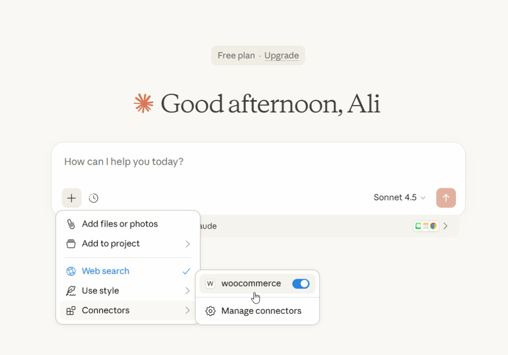 بعد ذلك أعدت فتح Claude Desktop، فظهرت مجموعة أدوات ووكومرس متاحة ضمن الدردشة باسم Woocommerce.