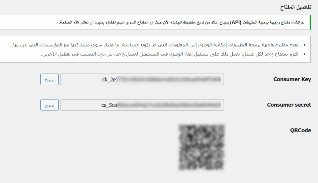 فظهر مفتاح API المكون من شقين هما Consumer Key و Consumer secret، حيث نسختهما واحتفظت بهما لأنني سأحتاجهما لاحقًا، إذ لا يمكن لأي جهة أو برنامج التحكم بالمتجر من خارج لوحة التحكم بدون معرفتهما، ولذلك أحتاج لتعريف Claude Desktop عليهما.