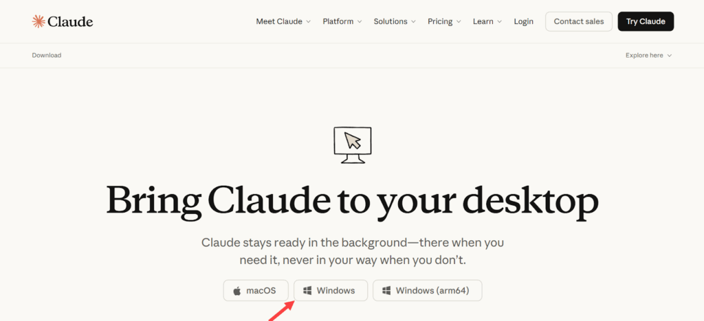 بداية انتقلت موقع برنامج Claude Desktop على الإنترنت، ثم نزلت النسخة المتوافقة مع نظام التشغيل لدي بالنقر على الزر المناسب.