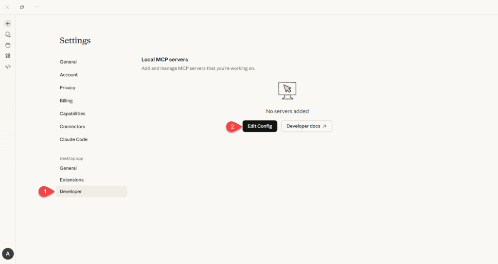 ثم انتقلت إلى تبويب Developer، ونقرت على زر Edit Config لإضافة MCP الخاص بووكومرس المتجر.