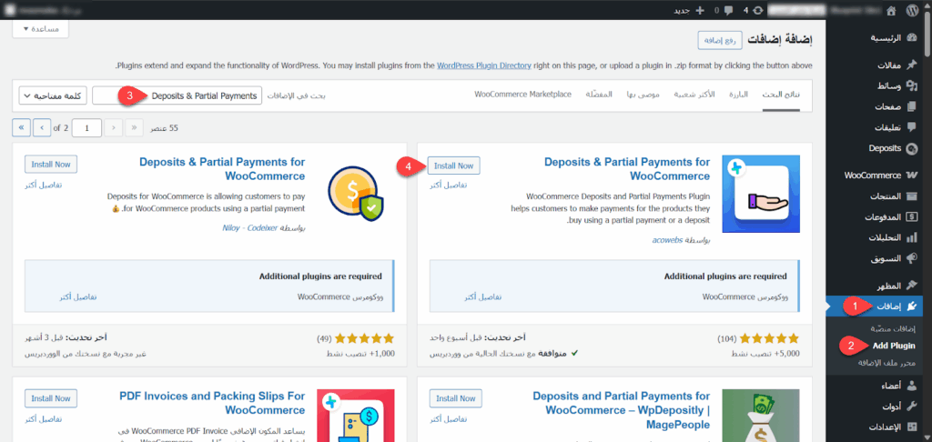 بداية ثبتت إضافة Deposits & Partial Payments على متجر عميلي من خلال الدخول إلى لوحة تحكم ووردبريس والتوجه إلى تبويب إضافات ثم النقر على أضف جديد وكتابة اسم الإضافة في مربع البحث ومن ثم تثبيتها وتفعيلها.