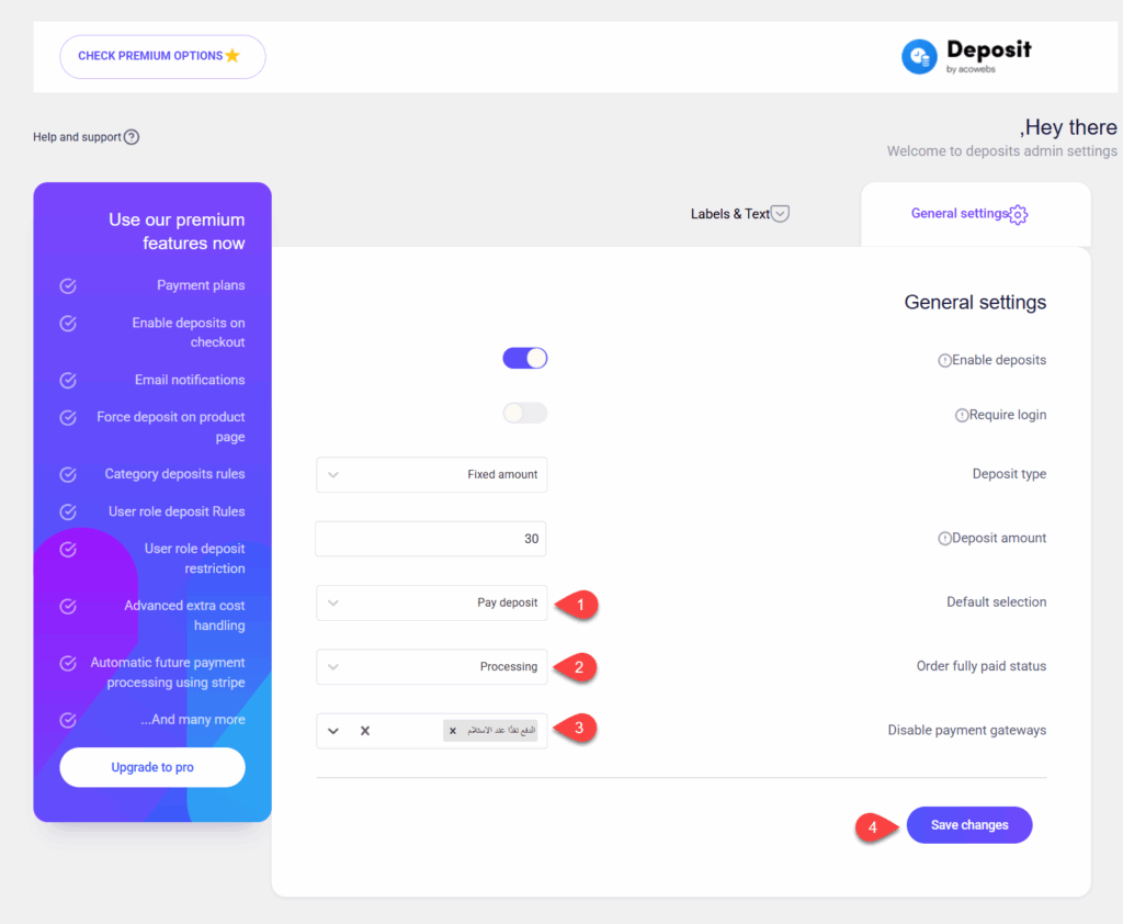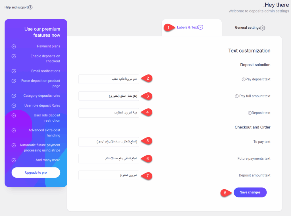 - Pay deposit text: من هذا الحقل غيرت اسم خيار العربون ليصبح أكثر وضوحاً للعميل، حيث كتبت عبارة (ادفع عربوناً لتأكيد الطلب) لإزالة أي لبس حول طبيعة الدفعة.