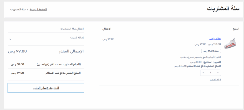 توجهت بعد ذلك إلى صفحة سلة المشتريات من أجل ملاحظة التغييرات التي جرت عليها، فوجدت أن الرسائل التي ضبطها مسبقًا تظهر بشكل واضح، حيث رأيت عبارة المبلغ المتبقي سيتم تحصيله عند الاستلام ظاهرة بشكل واضح بجانب المبلغ المطلوب سداده عند الاستلام، وذلك هو الحال مع جميع الرسائل.