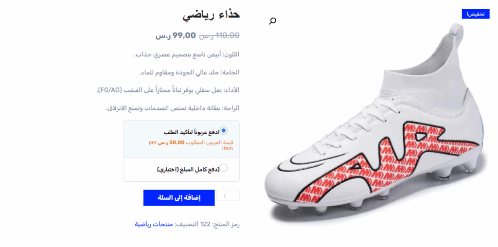 بعد الانتهاء وحفظ الإعدادات، انتقلت إلى واجهة المتجر لأرى كيف تبدو الأمور للعميل، ووجدت أن التغيير كان كبيرًا، فبدلاً من السعر الكامل الذي قد يسبب صدمة للعميل المتردد، ظهر خيار الدفع المجزأ بشكل مغرٍ ومنطقي، حيث يرى العميل في صفحة المنتج أنه مطالب بدفع مبلغ رمزي فقط (العربون) لإتمام الطلب.