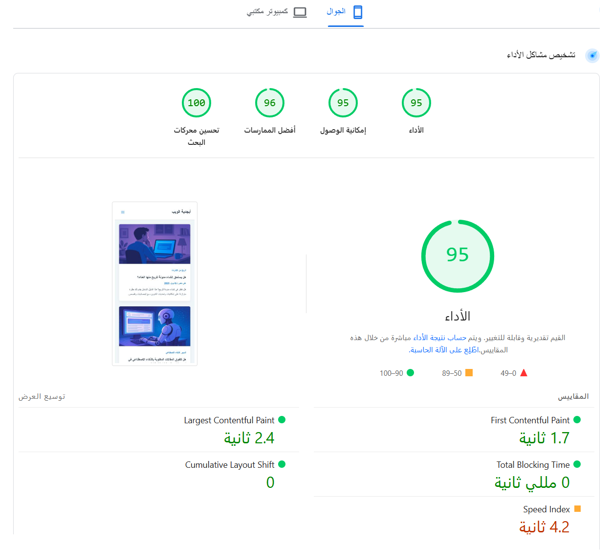 وبالفعل أدى ذلك إلى تحسن كبير في سرعة الموقع، إذ انخفض وقت بدء ظهور المحتوى إلى أكثر من النصف، وقد لمست هذا التحسن عمليًا أثناء التصفح، كما أظهرته أداة PageSpeed Insights.